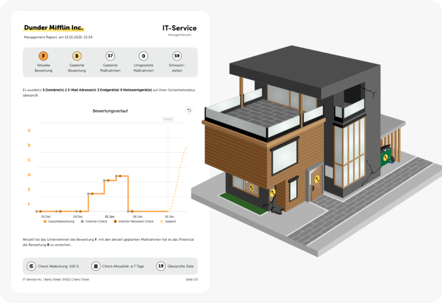 Machen Sie Ergebnisse für Ihre Kunden verständlich: Ein kompakter Report liefert Entscheidern die wichtigsten Fakten, während die Hausanalogie auch nicht-technischen Kunden eine anschauliche Erklärung bietet.