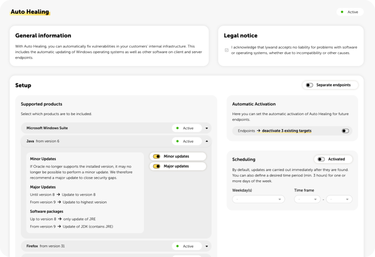 Con Auto Healing, è possibile correggere automaticamente le vulnerabilità dell'infrastruttura interna. Le applicazioni supportate includono Microsoft Windows Suite, Java, Firefox e Foxit PDF Reader.