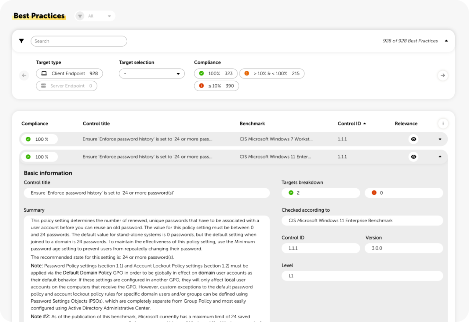 Con l'aiuto dei CIS Benchmarks, l'infrastruttura IT dei vostri clienti viene protetta in modo preventivo. Il livello di conformità e le descrizioni dettagliate sono disponibili nelle Best Practices.