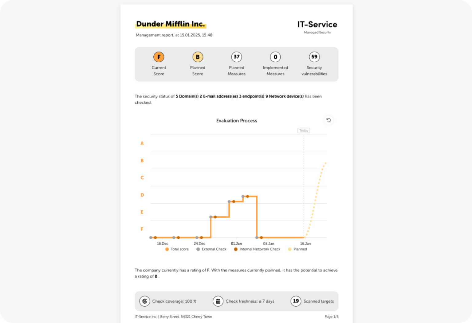Dopo il completamento di una verifica, il vostro cliente riceve una valutazione attuale della sicurezza secondo il sistema di voti scolastici da A a F. Inoltre, l'anteprima della valutazione mostra quante misure sono necessarie per una determinata valutazione.