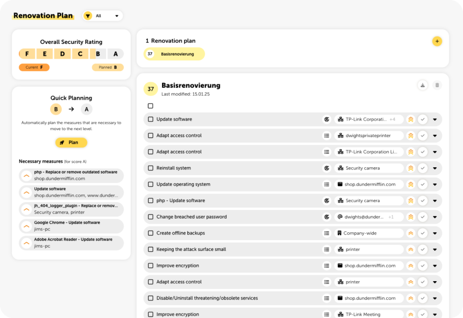 Il piano di ristrutturazione funge anche da lista di attività per i vostri dipendenti, e le misure completate possono essere contrassegnate come eseguite. Durante il prossimo controllo di sicurezza, Lywand indicherà se le misure hanno effettivamente avuto effetto e se le vulnerabilità sono state risolte.