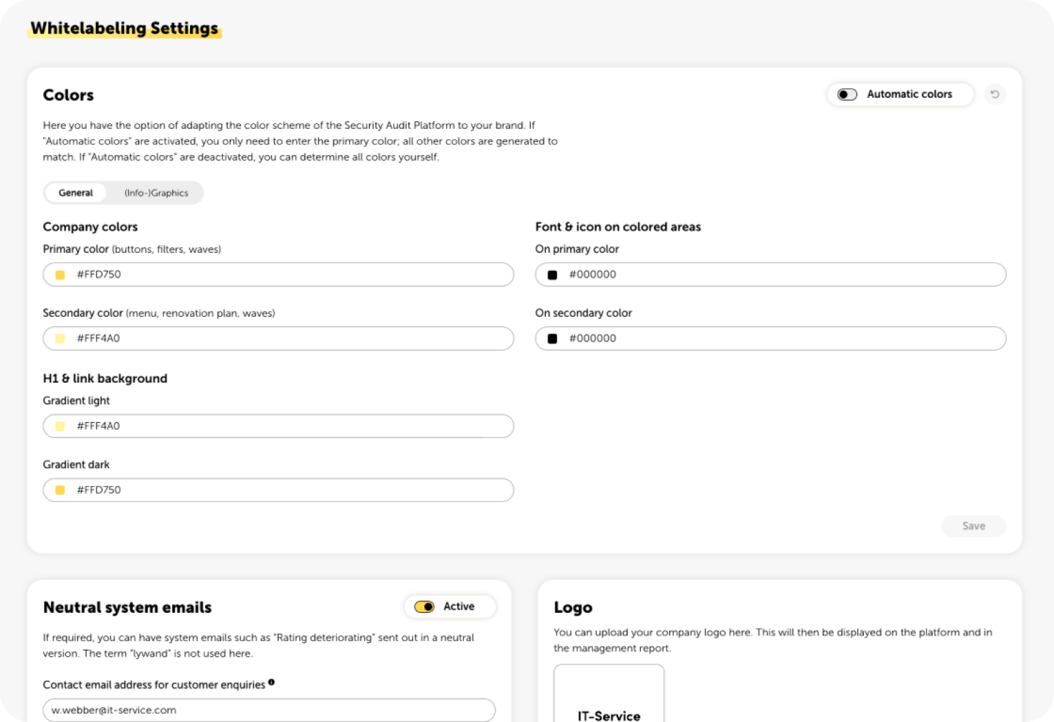 Con il whitelabeling, potete personalizzare la nostra security audit piattaforma in base al vostro look & feel. Avete la possibilità di effettuare diverse personalizzazioni, tra cui la modifica dello schema di colori, l'aggiunta del proprio logo, l'attivazione di e-mail di sistema neutre e l'utilizzo di un URL di accesso personalizzato.
