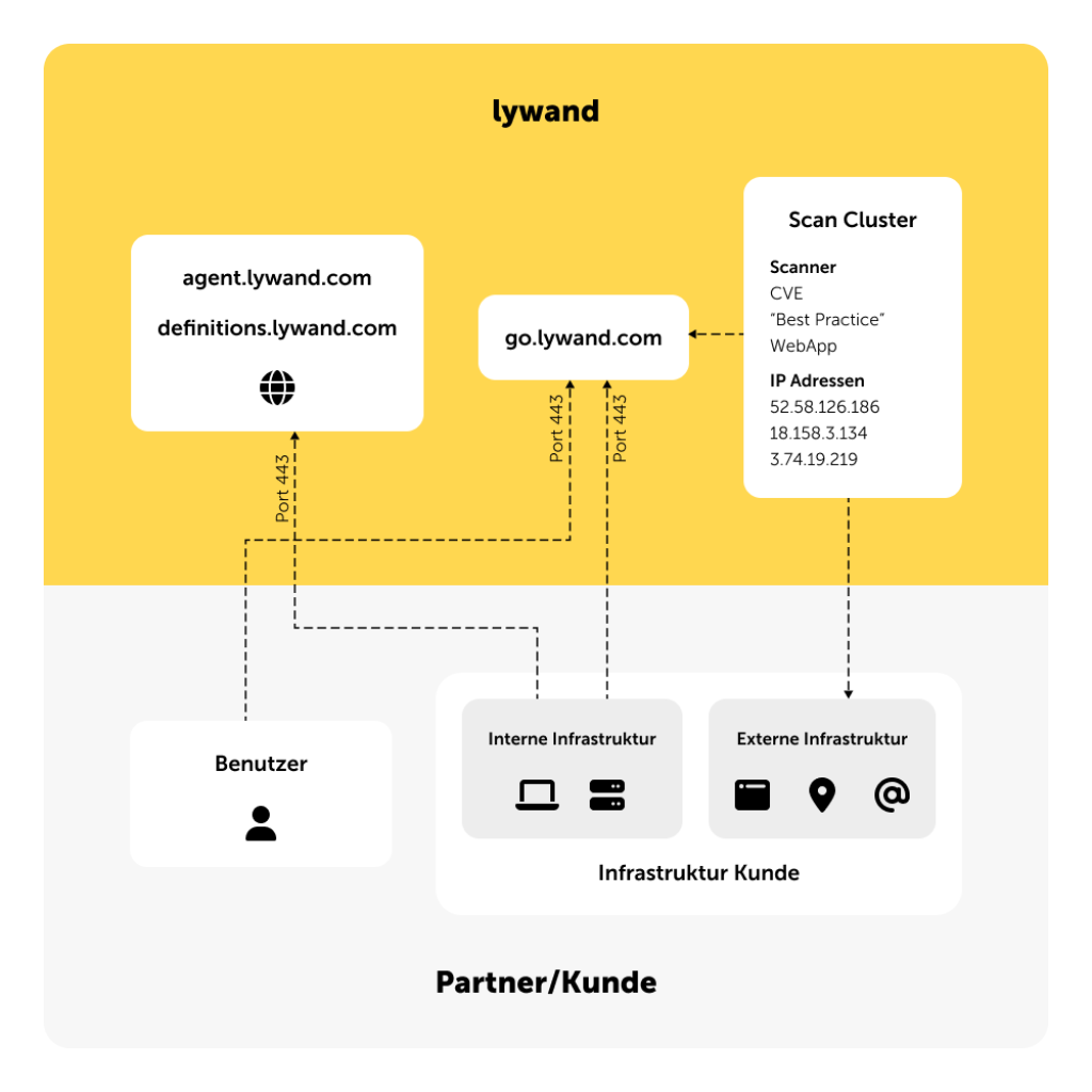 Für die Überprüfung von internen Endgeräten, wie Client oder Server Systemen ist unser eigens entwickelter lywand Agent zuständig. Dieser wird auf kompatiblen Windows-Geräten installiert und überprüft das System anhand bekannter Sicherheitslücken (CVEs) auf vorhandene Schwachstellen, Best-Practice-Konfigurationen und aktuelle Patchstände.