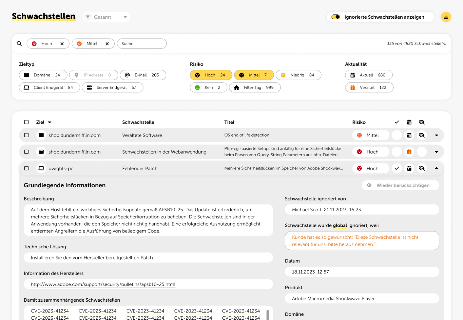 Im Menüpunkt „Schwachstellen“ gibt es eine Auflistung aller gefundenen Schwachstellen mit den jeweiligen Detailinformationen: