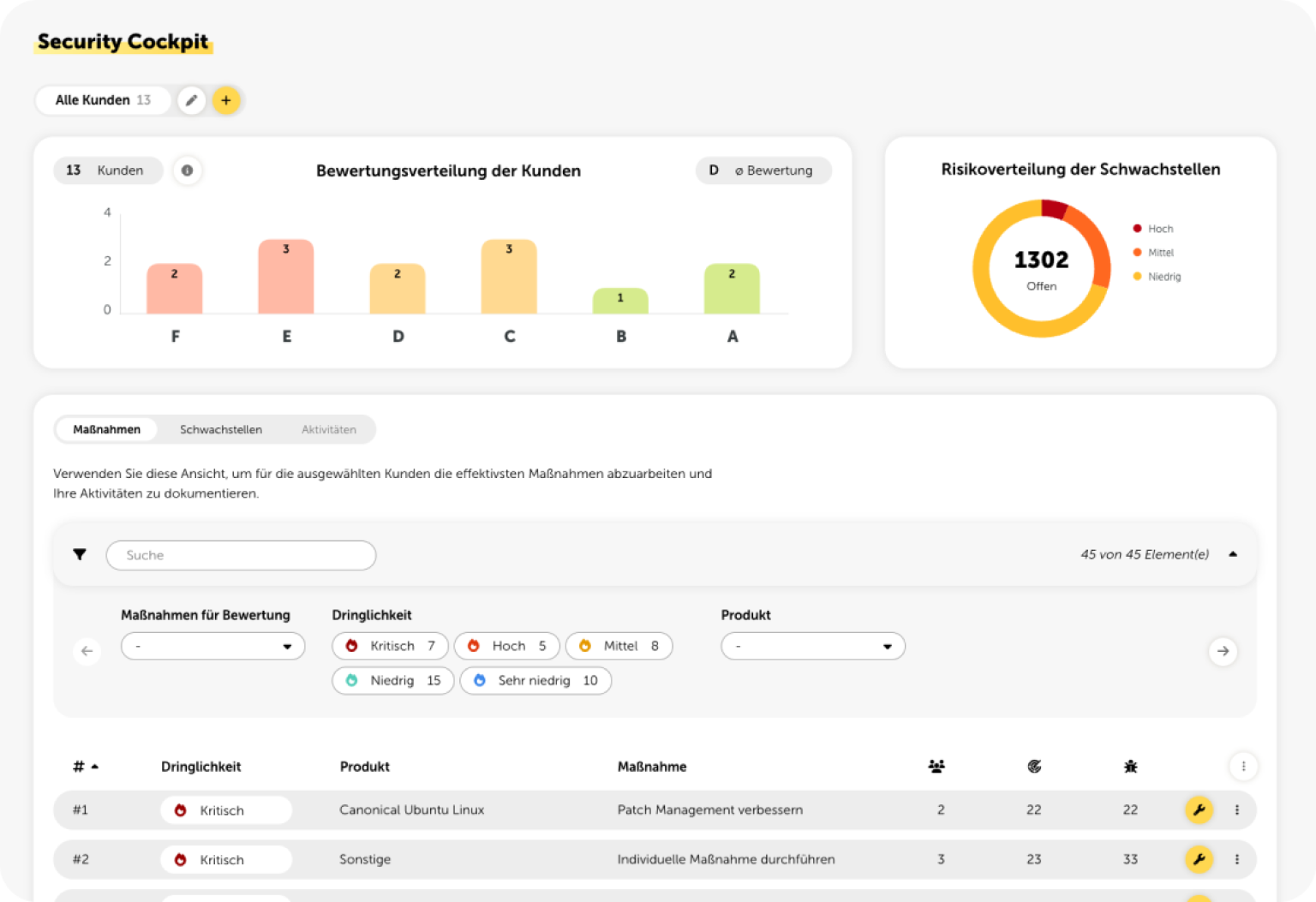 Diese Maßnahmen werden kundenübergreifend priorisiert, sodass Sie sofort erkennen, welche Schritte den größten Einfluss auf die Sicherheitslage haben.