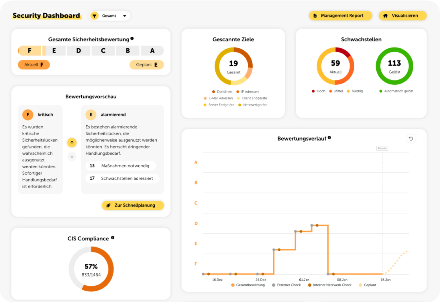 Der Verlauf der Bewertungen macht Entwicklungen und Fortschritte leicht nachvollziehbar. Besonders gefährdete Systeme, Produkte und zentrale Kategorien werden hervorgehoben – für ein ganzheitliches Verständnis auf einen Blick.